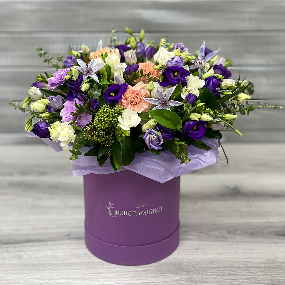 Шляпная коробка с цветами «Возвращение домой» из эустом и фрезии