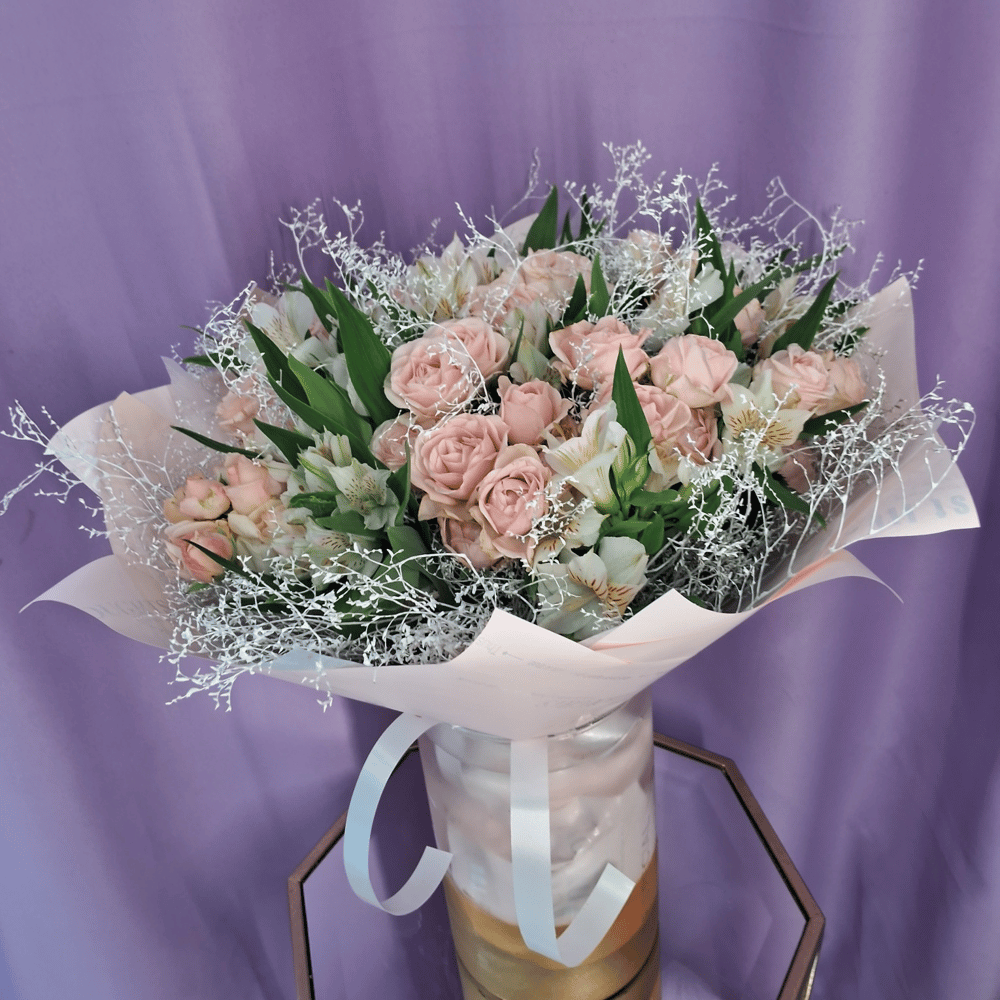 Роза кустовая 9 шт., альстромерия 10 шт., Сухоцвет , зелень упаковка
