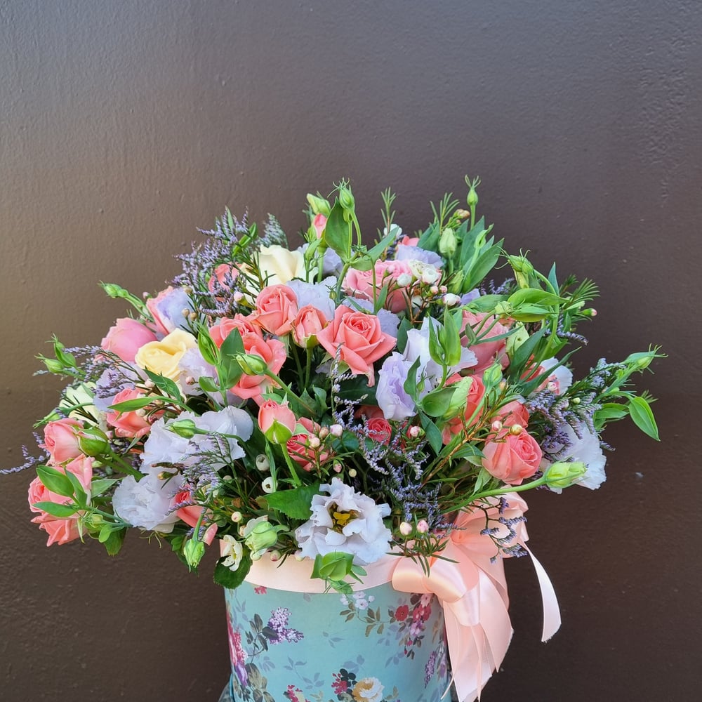 Шляпная коробка с цветами «Все дело в шляпе!» из роз и эустом