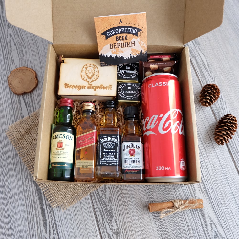 В наборе: 📌Коробка 20*19*7 см 📌Виски Jack Daniel’s 50 мл 📌Виски Red Label 50 мл 📌Виски Jameson Irish Whiskey 50 мл 📌Виски Jim Beam 50 мл 📌Камни для виски в деревянной коробке "Всегда первый" (6 шт) 📌Coca Cola 📌Шоколад Ritter Sport mini 📌Конфеты "Птичье молоко" с комплиментами 📌Открытка