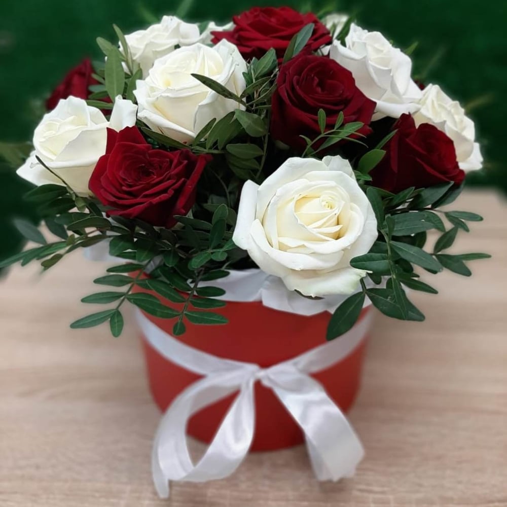 Сочетание роз разных цветов в стильной коробочке с зеленью. Цвет коробочки может отличаться от фото.