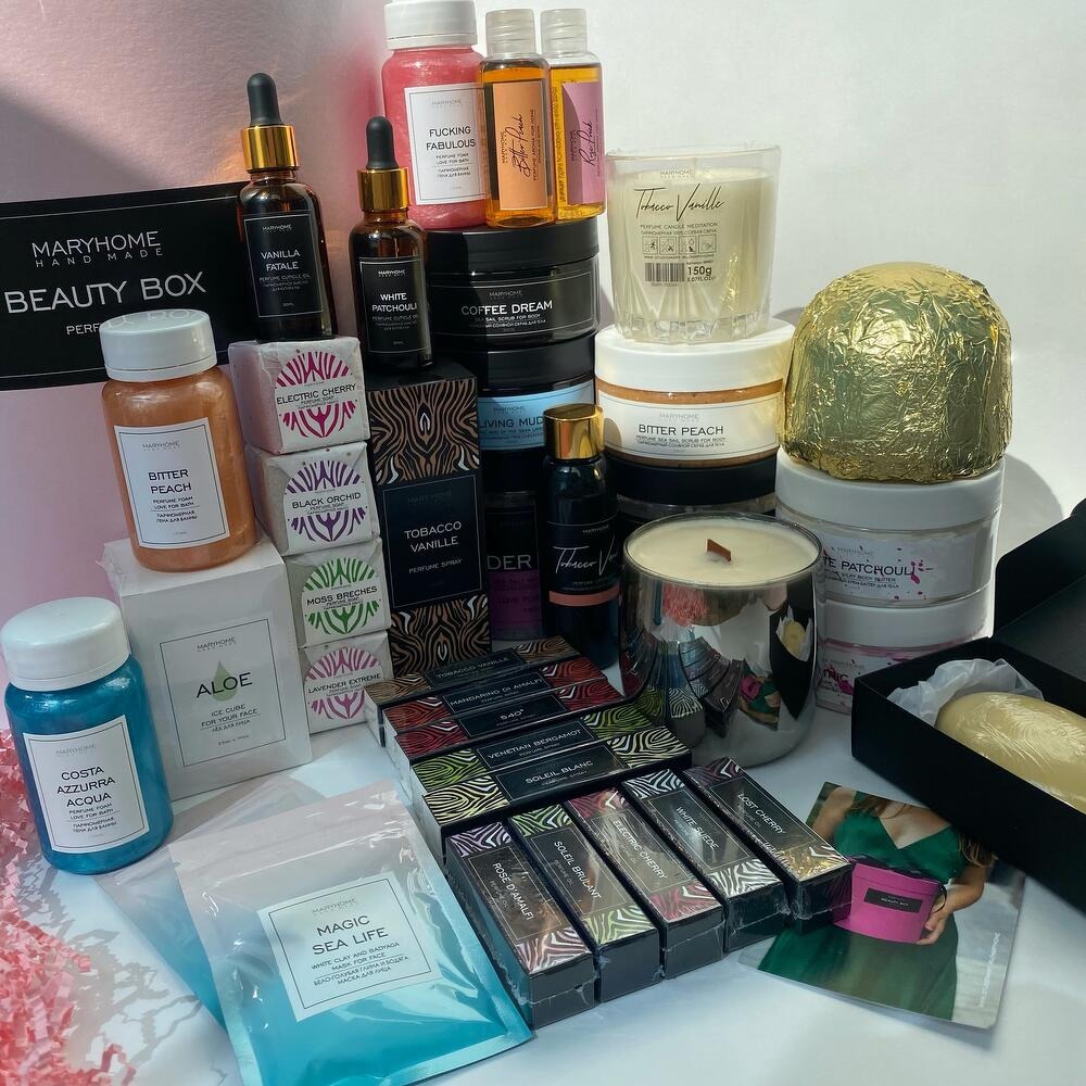 Побалуй себя приятной покупкой или сделай подарок близкому человеку. Описание набора: 1. Парфюмерная морская соль для ванн с пеной Love for Bath, 750g – 2шт 2. Парфюмированный, соляной скраб для тела Love for Bath; 3. Кофейный скраб для тела Coffee Dream”; 4. Питательный парфюмерный крем-баттер, 2шт; 5. Иловая сульфидная грязь Сакского озёра “Living Mud”; 6. Парфюмированная соляная бомбочка для ванны с пеной Конфета; 7. Парфюмерное мыло; 8. Парфюмерное мыло, 4 шт; 9. Арома для дома Perfume aroma for home, 2 шт; 10. Парфюмерное масло для кутикулы, 2 шт; 11. Лёд для кожи лица Ice cube for your face; 12. Парфюмерная свеча Perfume Candle Meditation; 13. Парфюмерная интерьерная свеча Perfume Candle Meditation; 14. Парфюмерное Кокосовое масло для тела, 100ml; 15. Духи, 100ml; 16. Масляные духи, 5ml - 6шт; 17. Духи, 10ml - 6шт; 18. Парфюмерная пена для ванны Love for Bath, 3шт; 19. Маска для лица “Magic Sea Life” с бело-голубой глиной и бадягой, 45g – 2шт 20. Подарочная, качественная коробка с атласной лентой, прекрасно впишется в Ваш интерьер. Закажи свою коробочку красоты и протестируй качественные парфюмерные средства, представленные в нашем магазине. Набор собирается в MIX Ароматов.