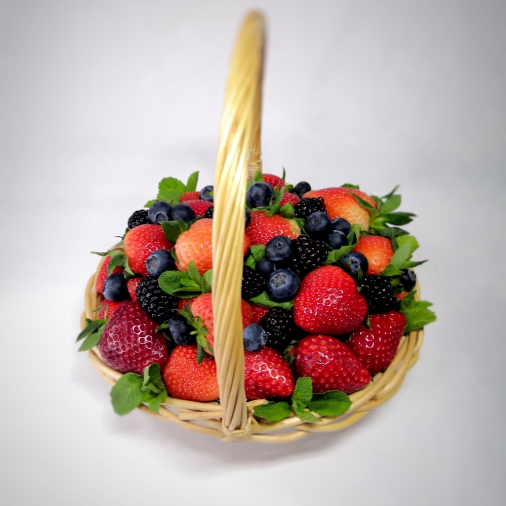 Корзина, полная свежих ягод: ароматная клубника, сладкая ежевика, малина и голубика, скрашенные освежающей мятой. Состав композиции: — клубника, — ежевика, — голубика, — мята