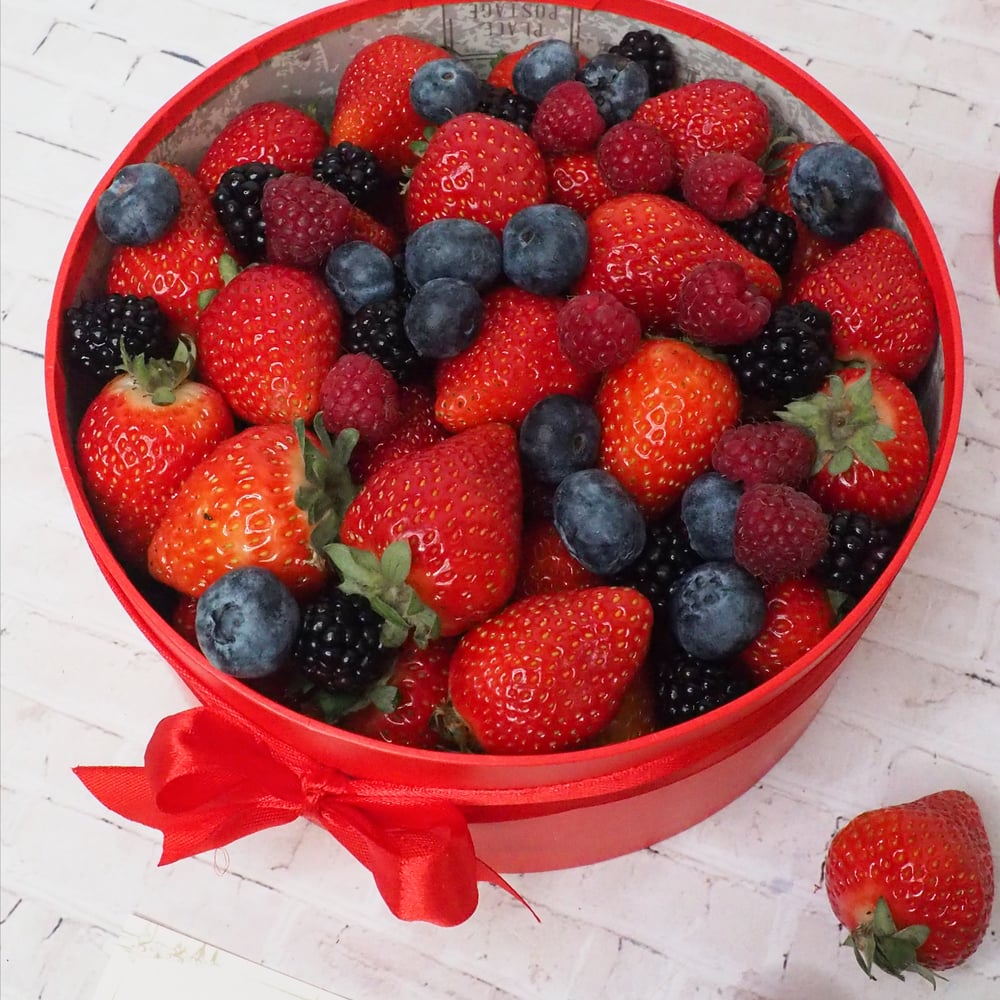 Отборная спелая Клубника и свежие ягоды: малина, голубика, ежевика в круглой подарочной коробочке Вес ягод - 1 кг Диаметр 20см Накрывается крышкой и перевязывается атласной лентой. Открытка с вашими пожеланиями в подарок