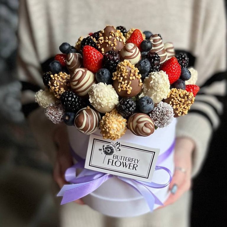 Съедобный фруктовый букет из клубники в шоколаде, голубики, ежевики и малины в шляпной коробке