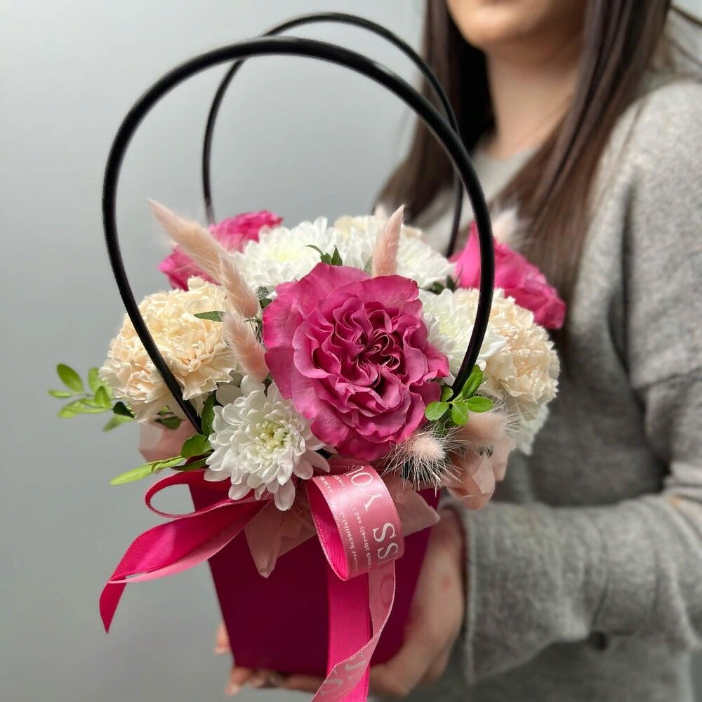 Коробка с цветами «Яркая композиция в розовой сумочке»
