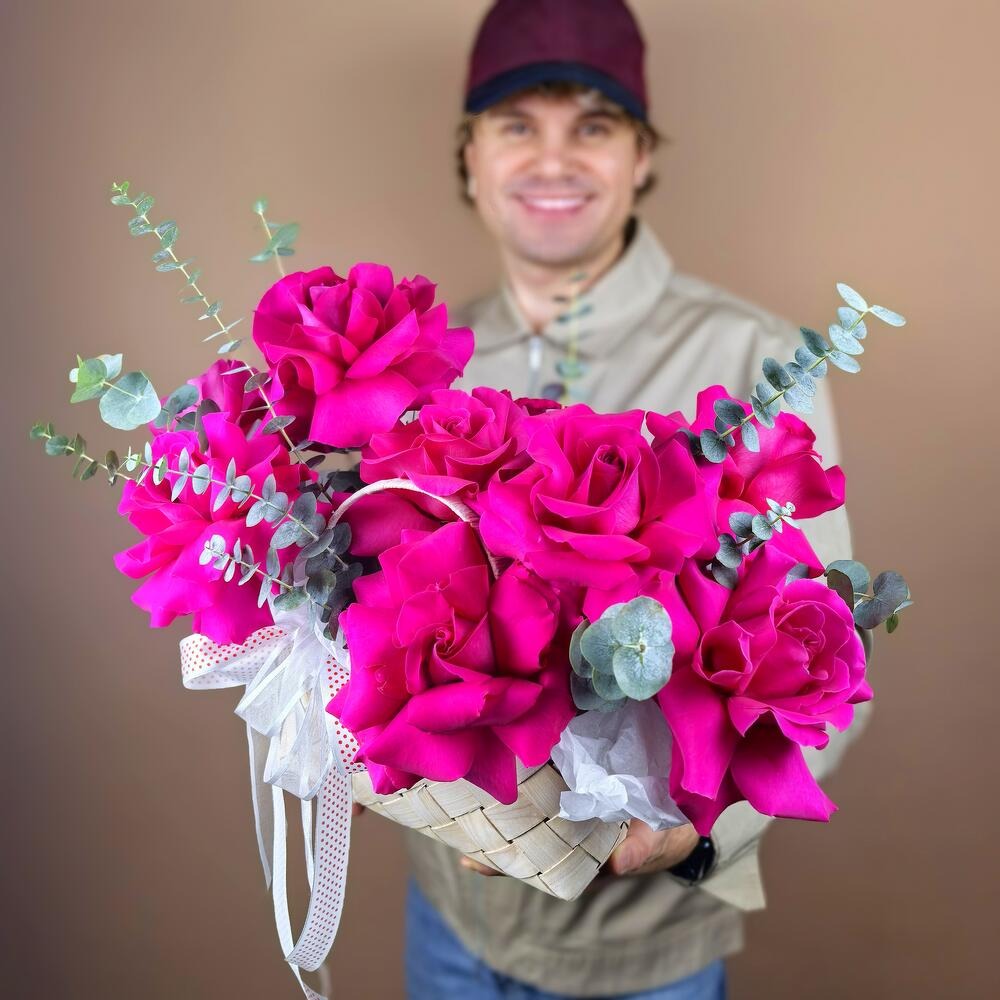 Эта композиция — настоящее произведение искусства, которое завораживает своей яркостью и изысканностью. Малиновые французские розы, словно созданные для того, чтобы покорять сердца, занимают центра...