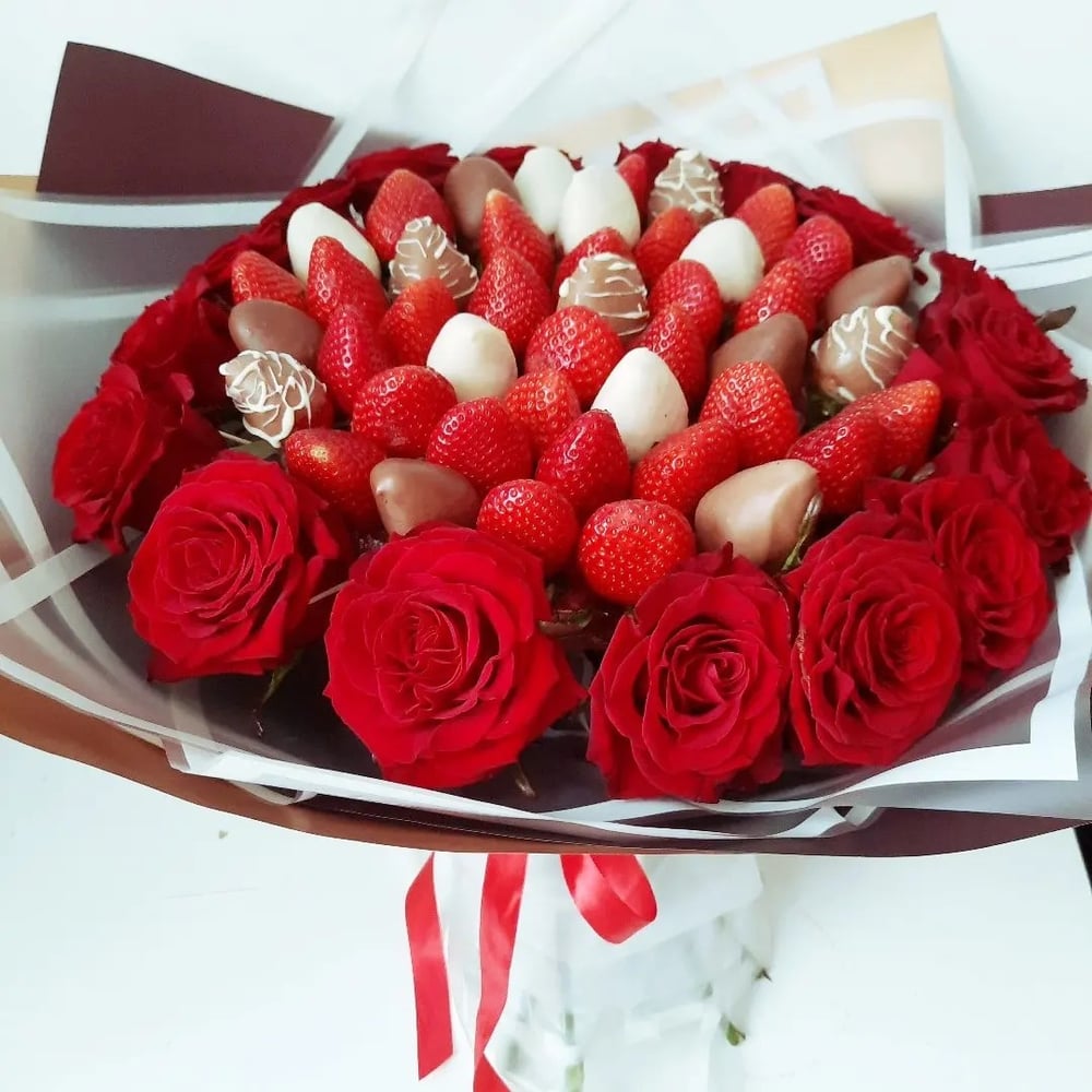 Клубника 22 шт Клубника в молочном и белом шоколаде 16 шт Роза красная 60 см 15 шт