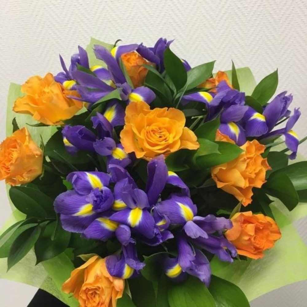 Яркий весенний букет с ирисами и оранжевыми розочками! Поднимите настроение своим близким и любимым! При желании можно изменить цвет роз (обязательно согласовав с флористом наличие цвета роз в магазине), ирисы будут не менее хорошо смотреться с желтыми или розовыми розами.