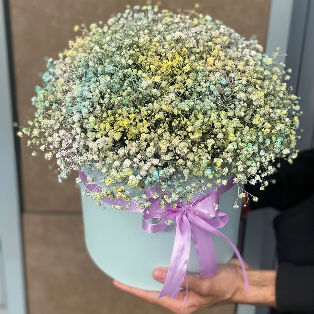 Шляпная коробка с цветами «Яркая жизнь» из гипсофил