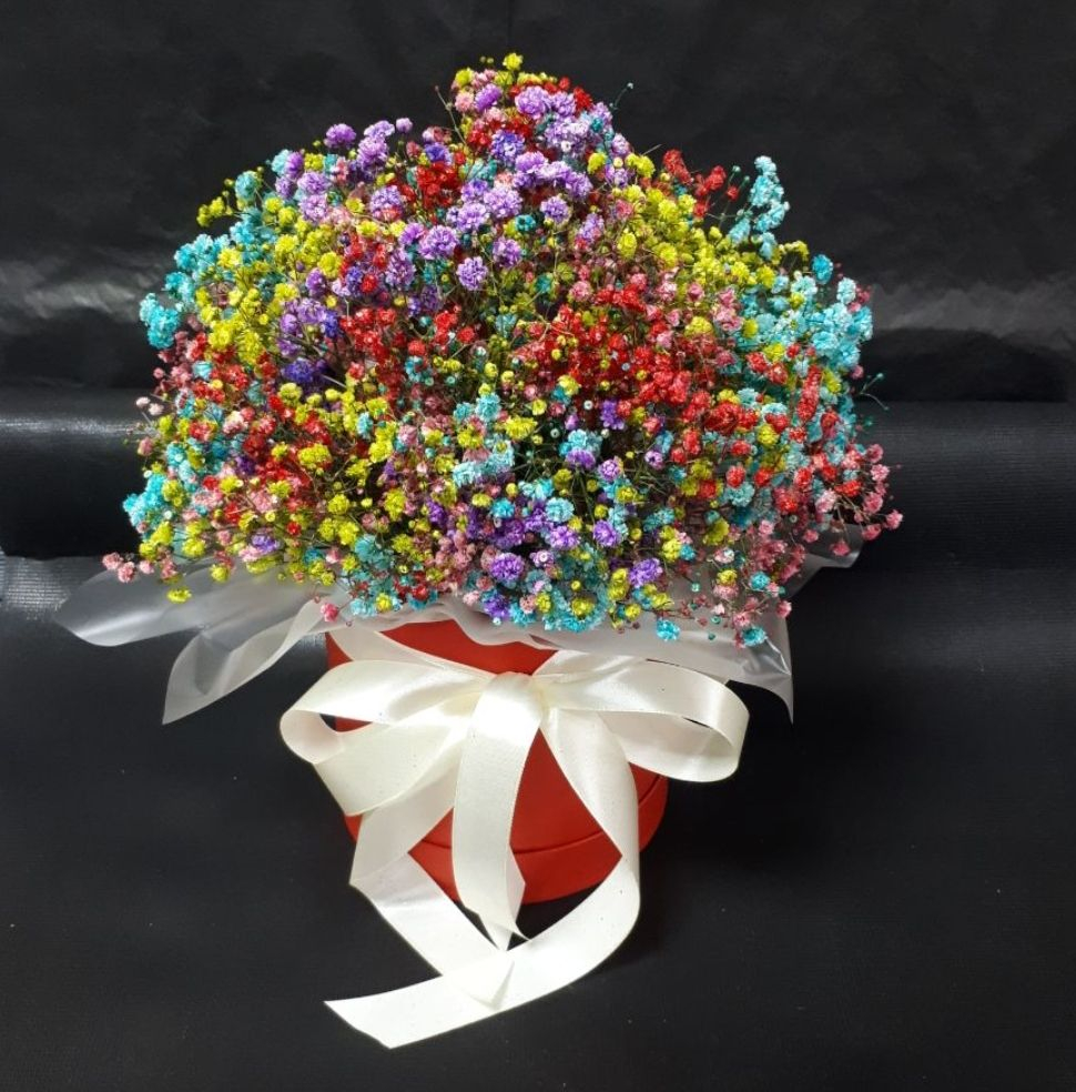Шляпная коробка с цветами «Яркие Минутки» из гипсофил
