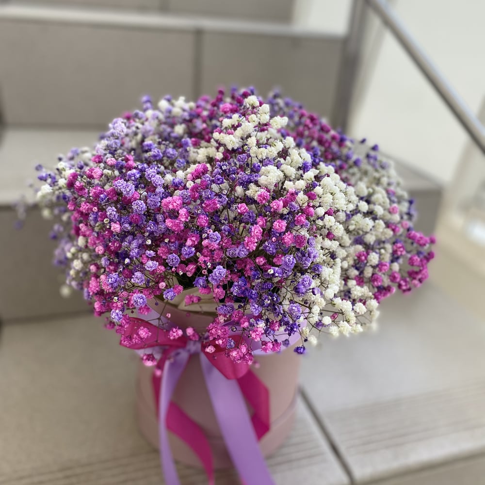 Воздушная цветная гипсофила в стильной шляпной коробке пудрового цвета