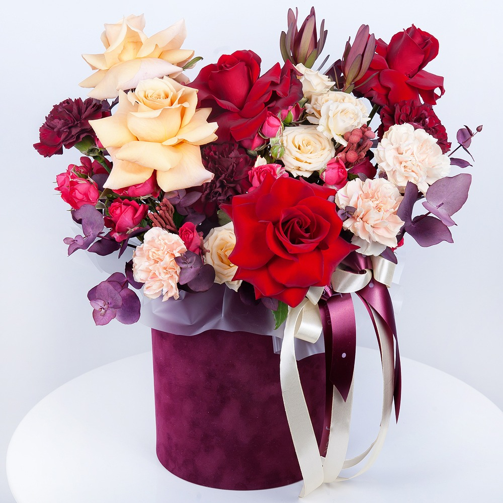 Откройте для себя удивительный мир красоты и гармонии в нашей уникальной композиции из цветов в шляпной коробке! Здесь каждая деталь продумана до мелочей, чтобы создать неповторимый подарок для, тех, кто вам дорог.