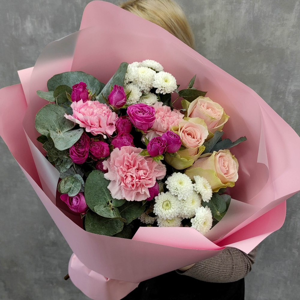 Состав: Роза Frutteto - 3 шт, Диантус Pink - 3 шт, Хризантема коконат - 2 шт, Роза кустовая Clas sensation - 3 шт, Фисташка - 2 шт, Эвкалипт - 2 шт, Матовая пленка розовая и белая матовая прозрачна...