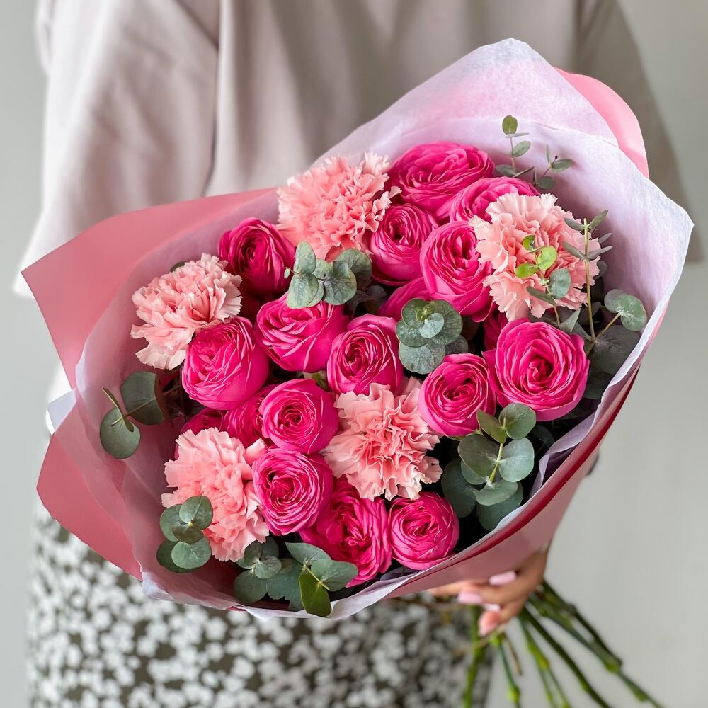 Яркий букет из пионовидных роз и гвоздик