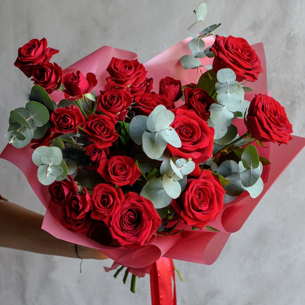 Этот роскошный и яркий букет из роз и эвкалипта станет великолепным подарком и создаст массу положительных эмоций! Красивые цветы, собранные в букет, упакованы в стильную упаковку, которая подче...