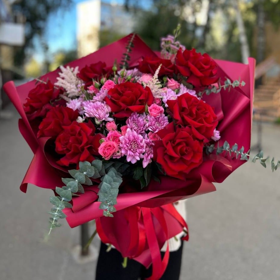 Букет «Яркий и огромный» из роз и хризантем