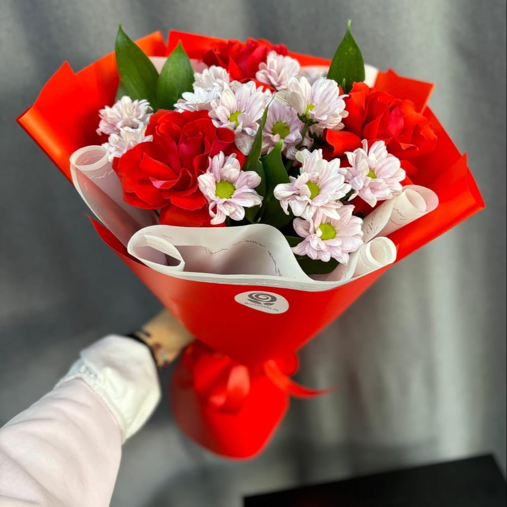 Букет "Яркий комплимент" состоит из алых роз эквадор, кустовых хризантем, оформленный в ярко-алую упаковку