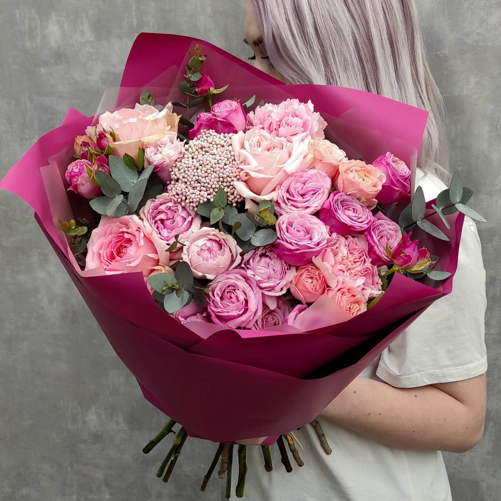 Состав: Роза Пинк Охара - 4 шт, Роза кустовая Candy Flow - 1 шт, Роза кустовая Lady Bomdastic — 4 шт, Роза кустовая Madam Bombastic — 2 шт, Озотамнус - 1 шт, Диантус Pink - 2 шт, Фисташка - 2 шт, Эвкалипт цинерия - 2 шт, Матовая пленка насыщенный розовый и белая матовая прозрачная уголком Размер: Диаметр: 40 см / Высота: 50 см