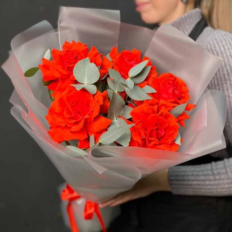 Яркий стильный букет из алых роз