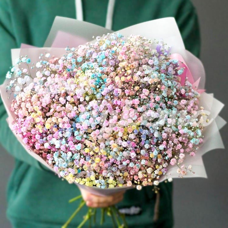 Гипсофила - нежный и воздушный цветок, который придает букету легкость и романтичность. Разноцветная палитра букета однозначно поднимет настроение получателю. Этот букет идеально подойдет для подарка близким людям, особенно на особые и важные события в их жизни.