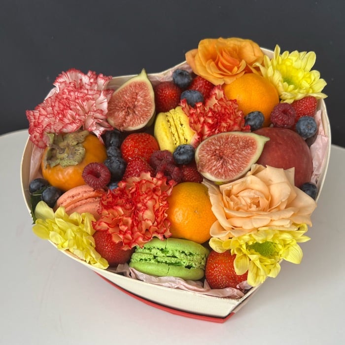 Макарун 3;яблоко 1;мандарин 2;хурма 1 Шт;инжир 1;клубника 7;малина 50 гр;голубика 50;цветы микс;сердце коробка