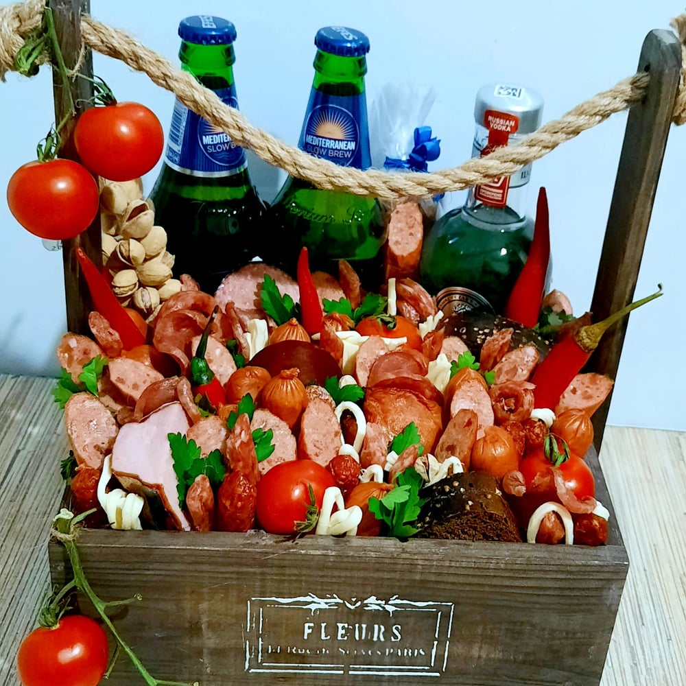 Мясные деликатесы Сыр Снеки Хлеб Помидоры черри Пиво Водка