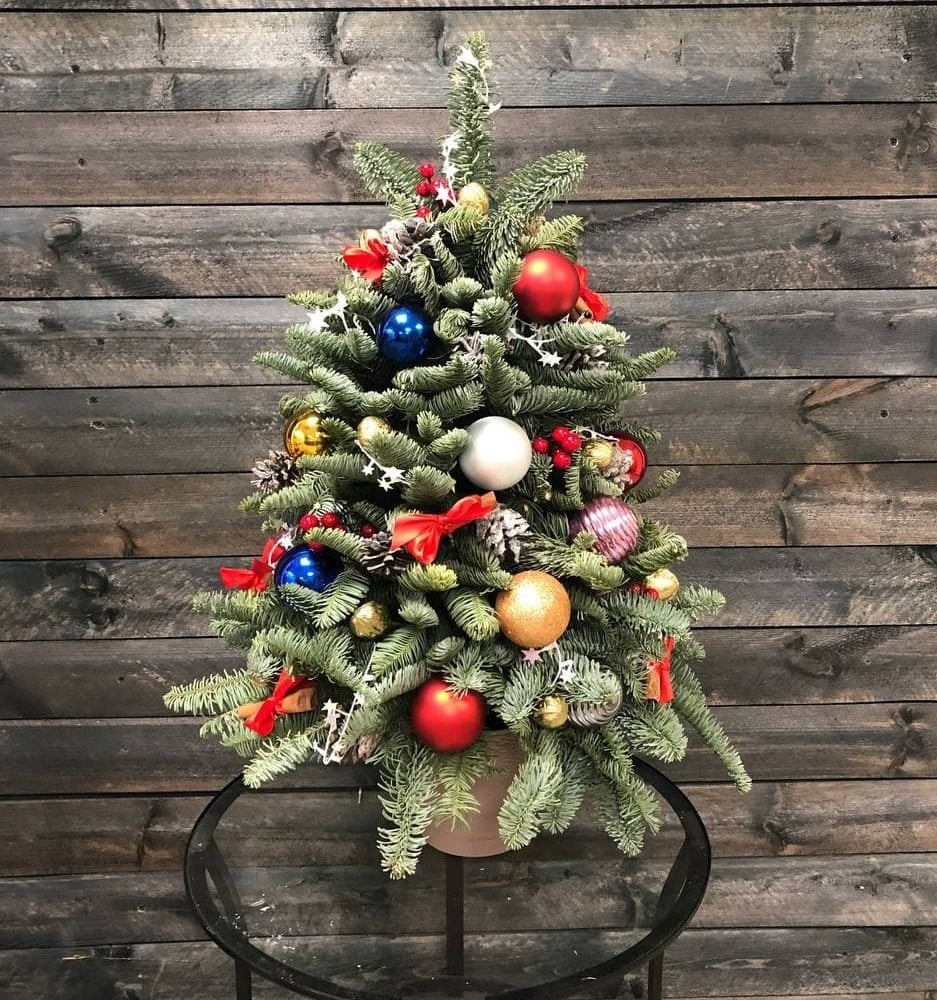 Шикарная декоративная ёлка из ветвей голубой канадской ели (нобилиса). Нобилис наполняет комнату ароматом хвои и, при этом, не сыпется. Долго сохраняет свои декоративные свойства и неизменный внешний вид. Уход за такой ёлочкой минимален. Достаточно лишь изредка поливать основу водой.