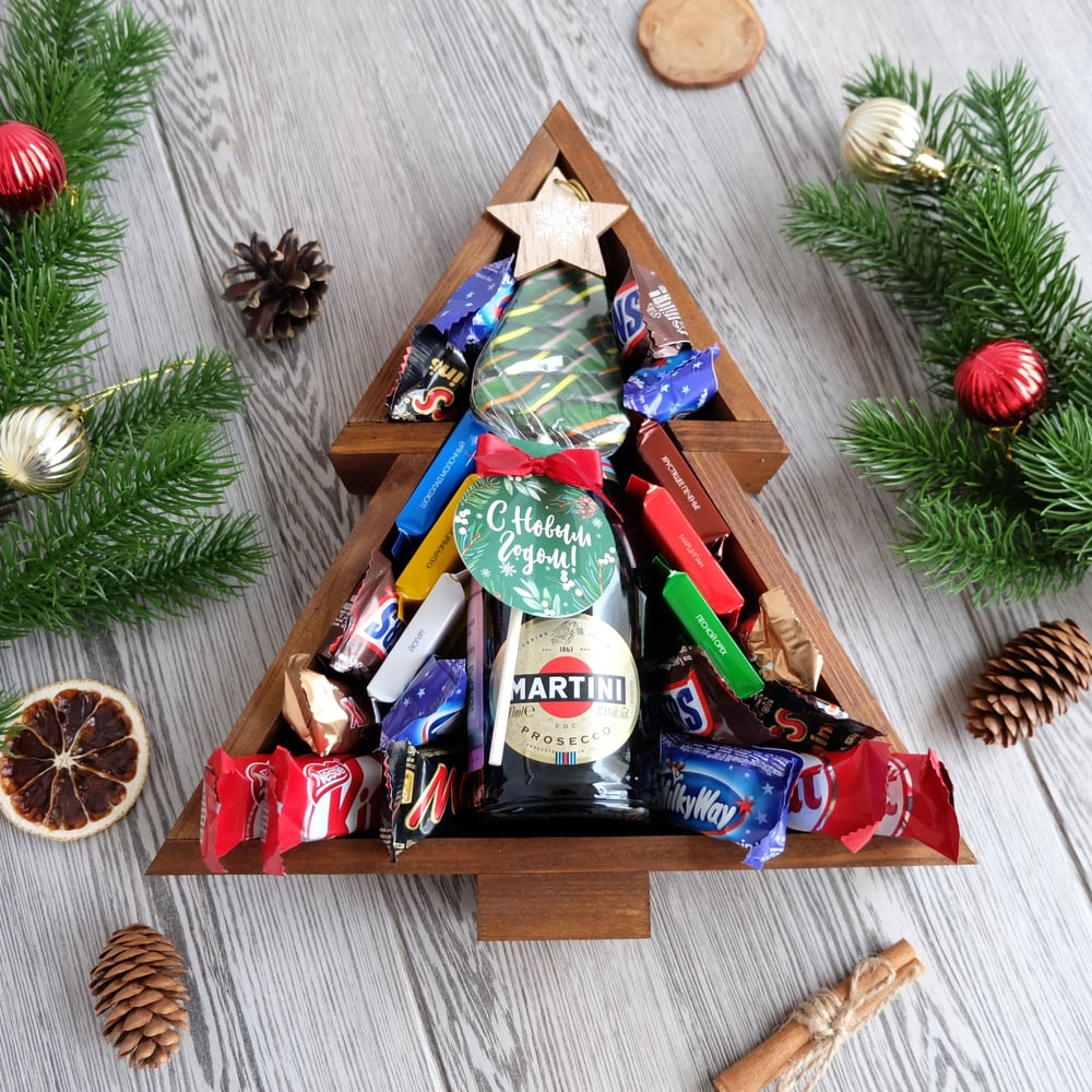 В наборе: 📌Ящик деревянный в форме ёлочки 28*24,5*4,5 см 📌Martini Prosecco 187 мл 📌Шоколадные батончики Milky Way Minis, KitKat Mini, Snickers Minis, Twix Minis, Mars Minis 📌Шоколад Ritter ...