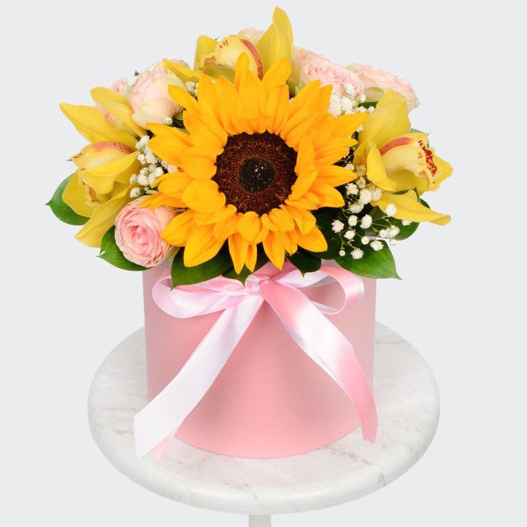 Шляпная коробка с цветами «Закат для двоих» из роз и подсолнухов