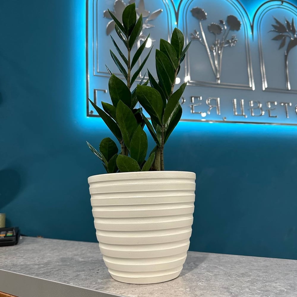 Замиокулькас представляет собой низкое травянистое растение. Корневище у него клубневидное, а корни толстые и мясистые. Толстый и сочный рахис очень нужен цветку, так как в нем он запасает воду. Кожистые на ощупь перышки довольно плотные. В длину листовая пластина может достигать около 100 см. Во время длительного засушливого периода растение скидывает листочки с верхней части листовой пластины, благодаря этому происходит уменьшение испарения влаги, а снизу черешок нужен для сохранения жидкости для куста. Еще скопление влаги происходит и в подземном клубне. Хорошо разросшийся куст может начать цвести и при выращивании в домашних условиях. Коротенький толстый цветонос появляется из основания листьев, он несет початок-соцветие бледно-кремового окраса. Полный ассортимент живых и декоративных растений и цветов, декоративных предметов интерьера для дома и офисов представлены по адресам: г. Ростов-на-дону, пр. Буденновский д.93/295, бул. Комарова д.20в/9а. Ждем вас в нашей "Галерее цветов" 🌿🌿🌿
