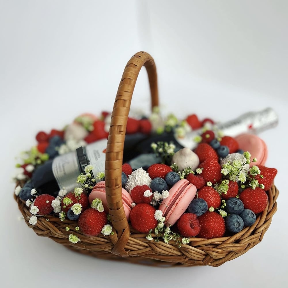 Восхитительная композиция для спонтанного праздника без повода)Корзиночка, «Завтрак у Тиффани», была создана по спецзаказу, но нам не сдержаться, как мы хотим собирать их снова и снова! Композиция нежная, сочная и романтичная😍 дополнена напитком и сопровождается трогательным посланием в свитке❤️ В составе: клубника, клубника в шоколаде, макарунс, голубика, малина и цветы гипсофилы. Нежное сочетание ягод и шоколада, изысканных макарунс и напитка навевают легкое романтическое настроение! Идеально к: - Свидание - День рождения - Без повода - Корпоративный подарок Примечаем, что корзиночки разные, и композиция может немного отличаться от фотографии, но точно не уступит в привлекательности 🤗
