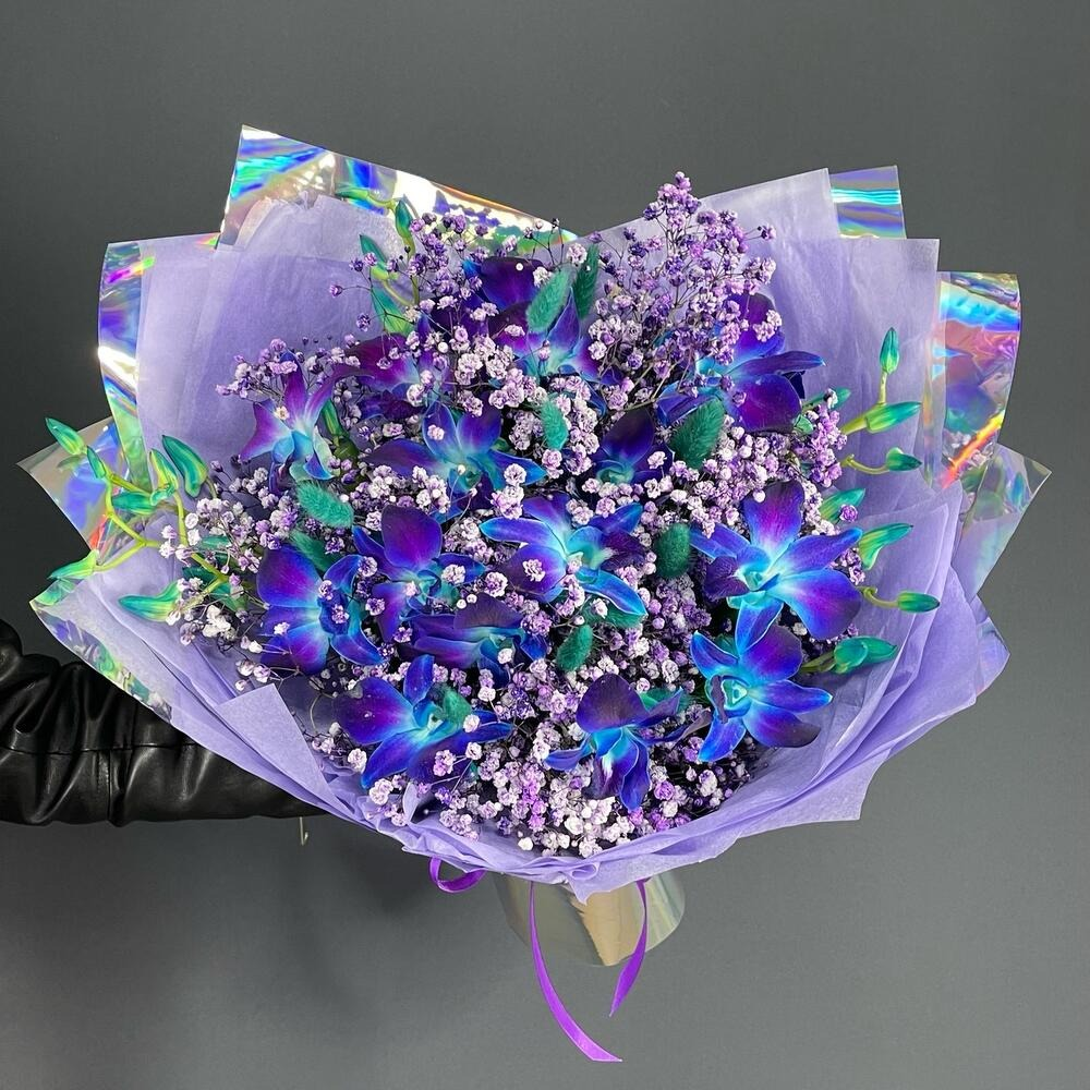 Космические орхидеи с воздушной гипсофилой в зеркальной упаковке