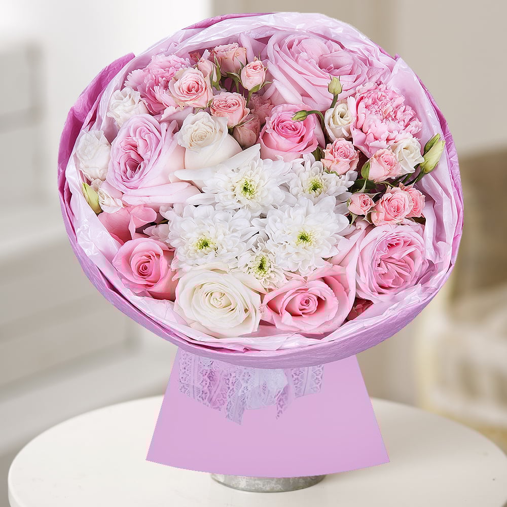 Букет «Зефирка» — это нежное облако ароматов и красок, созданное специально для вас. В нём собраны самые изысканные цветы: розовые и белые розы, кустовая хризантема, пионовидная роза, кустовая роза, гвоздика и лизиантус. Современная упаковка придаёт букету особую изюминку и делает его ещё более привлекательным. Этот букет станет отличным подарком для ваших любимых и близких людей