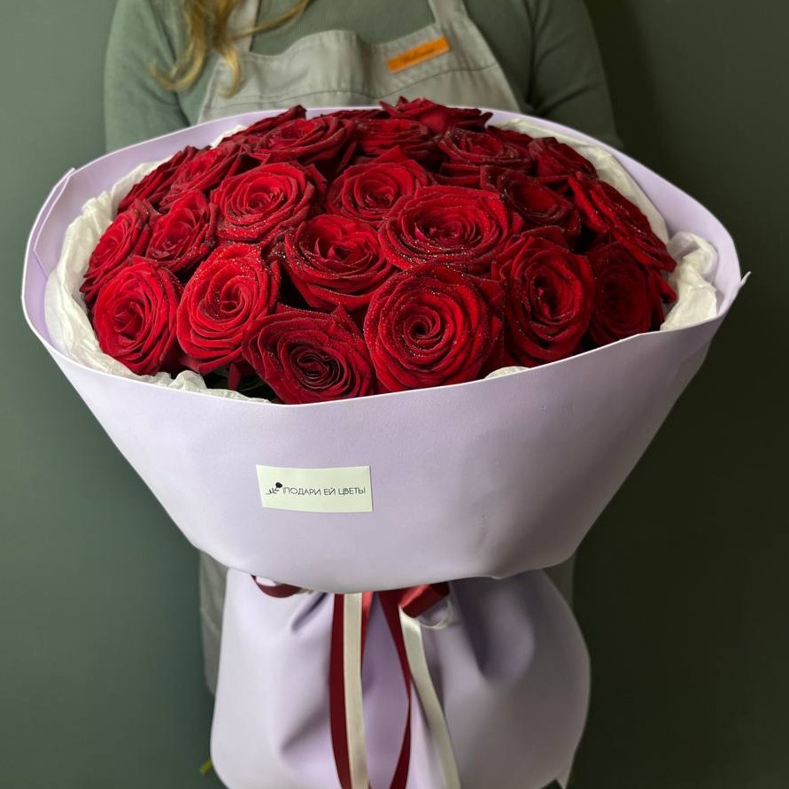 Чувственный букет из безупречных красных роз, украшенных сиреневой упаковкой, источает страсть и чувственную энергию. Он прекрасно подойдет как романтичному признанию в любви, так и яркому поздрав...
