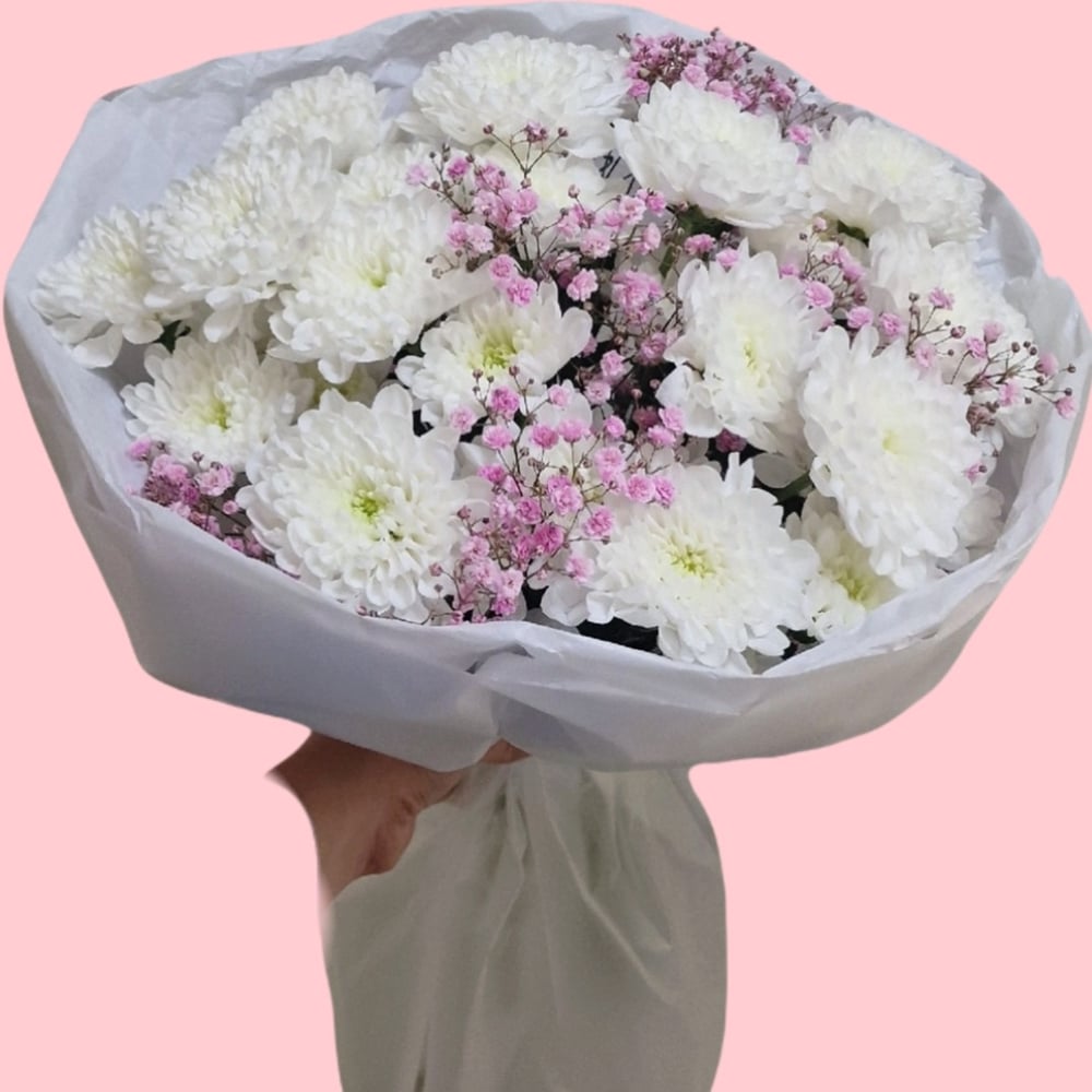 Букет «Зефирка нежная» из хризантем и гипсофил