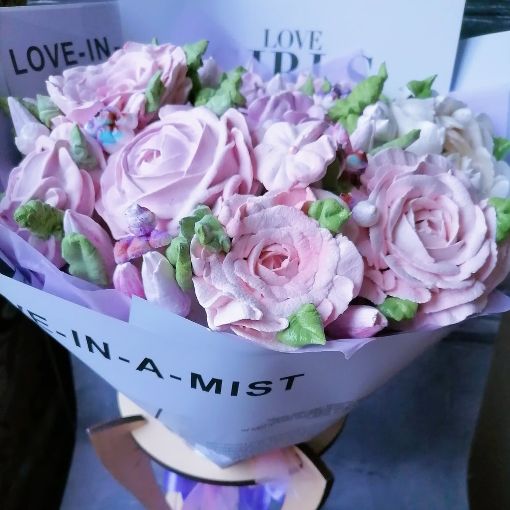 Букет сделан из зефира ручной работы. Состав Агар-агар Сок Пюре ягодное Сахар Инвертный сироп Яичный белок Ванилин