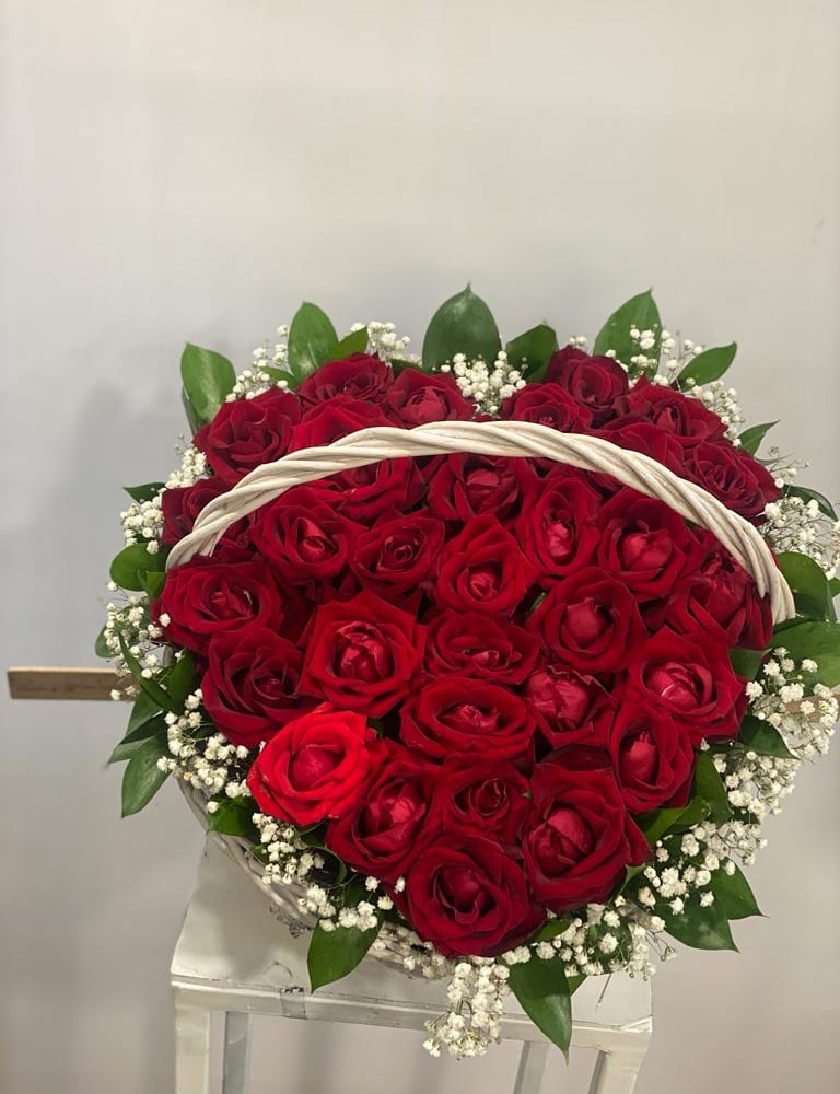 Корзина с цветами «Жардин» из роз и гипсофил