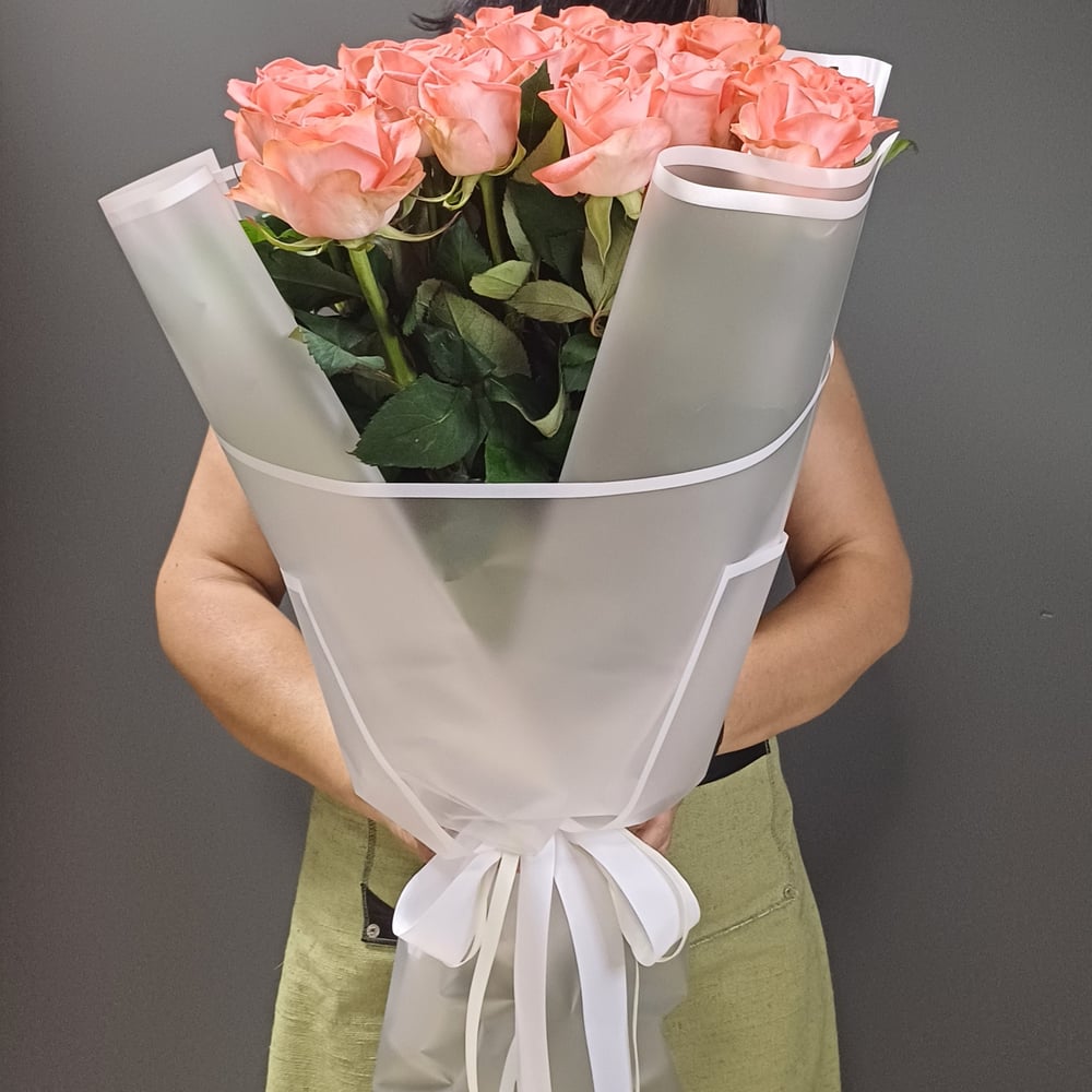 Букет из персиковых роз — это изысканная и романтичная композиция, которая символизирует благодарность, искренность и нежные чувства. Персиковые розы, с их теплым, мягким оттенком, создают атмосферу уюта и гармонии. Лепестки этих роз имеют нежный персиковый цвет, который варьируется от светлого, почти кремового, до более насыщенного абрикосового. Такой букет излучает утонченную элегантность и одновременно простоту, что делает его идеальным выбором для самых разных событий — от свадеб до благодарственных жестов. Он придаёт любому моменту особую теплоту и делает его незабываемым.