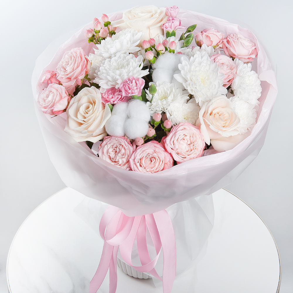В букете, словно в нежном облаке, объединены кустовые хризантемы, пионовидные розы и гвоздики гиперикумом. Дополненный бутонами хлопка, букет создает атмосферу нежности и утонченности. Современная упаковка подчеркивает красоту букета, который прекрасно подойдет для выражения самых искренних эмоций.