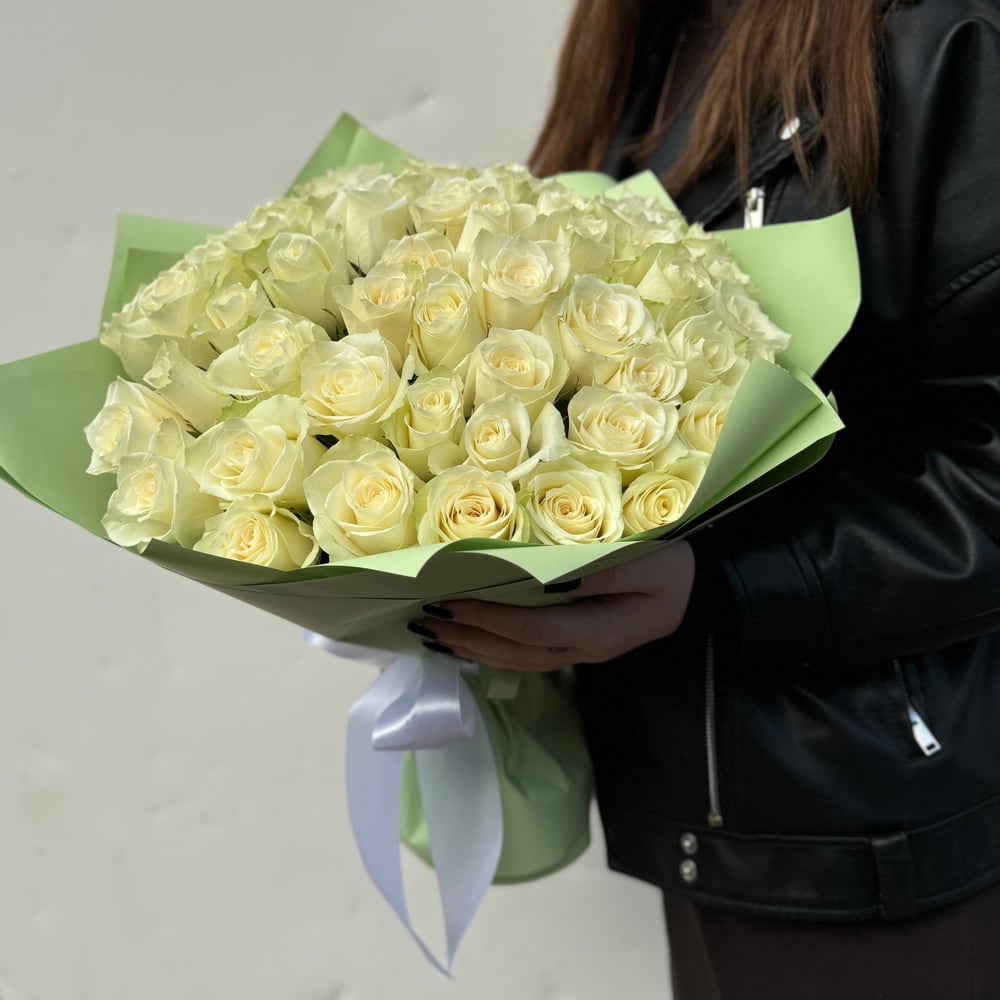 Букет из 51 крупной розы нежного белого цвета - изысканный, нежный и теплый подарок, который согреет сердце той, кому он предназначен. Романтичное и трогательное признание в любви и самых теплых, искренних чувствах!