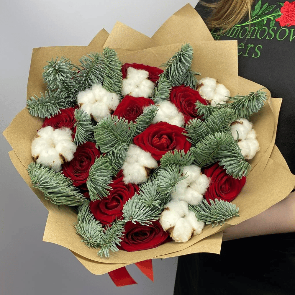 Пышный зимний букет из веточек ели Нобилис, красных одноголовых роз и белого хлопка. Отличный подарок, который подарит получателю новогоднее настроение в зимнюю пору. Главный плюс букета - долговеч...