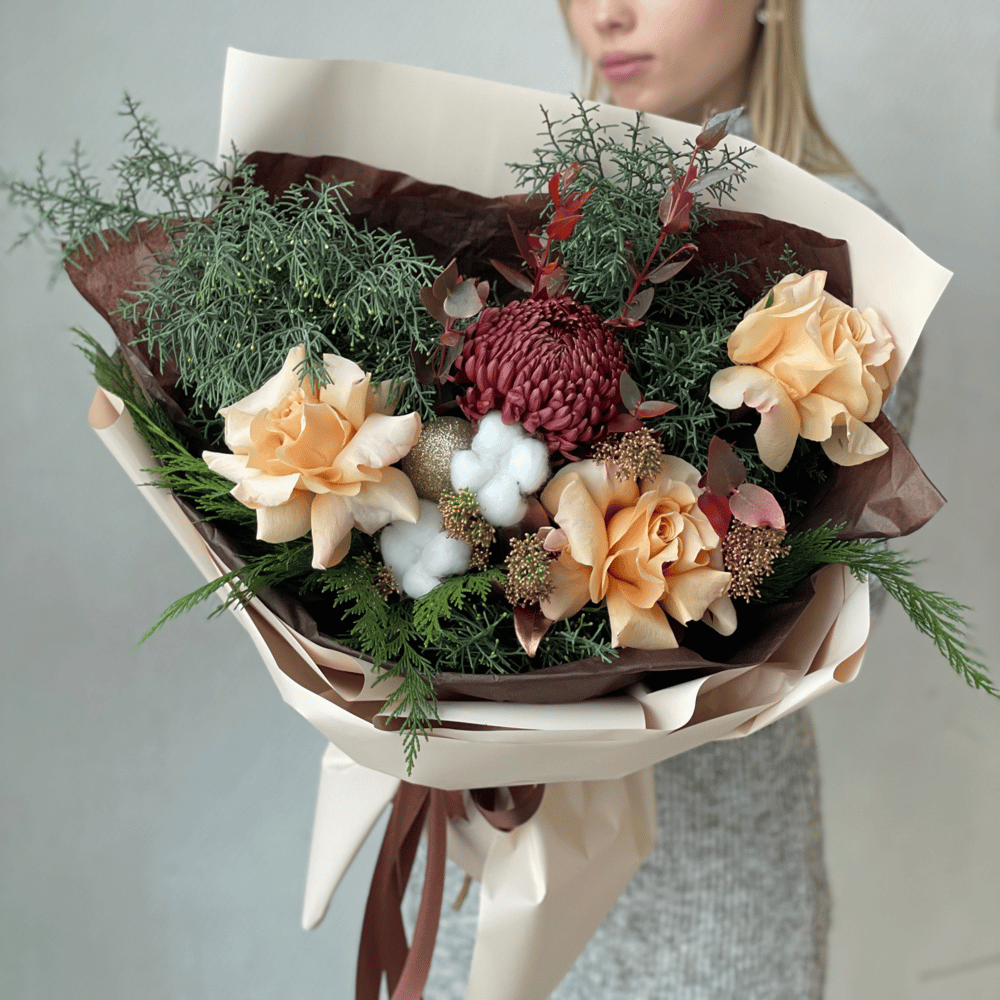 Зимний букет с шарами и пихтой из роз