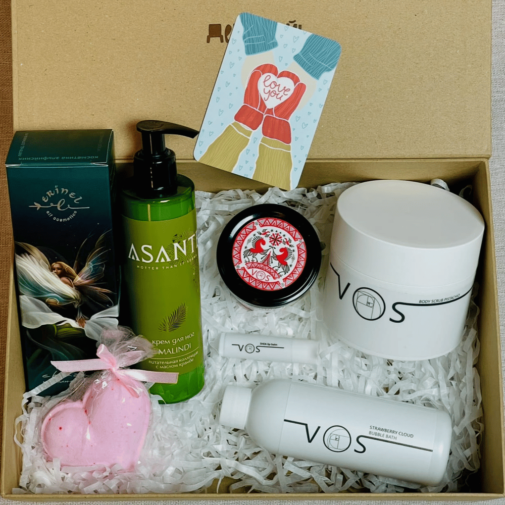 Подарочный Зимний СПА-набор — изысканный выбор для девушки, которая любит красивые ритуалы, уютные вечера и качественную натуральную косметику. Каждый продукт в наборе создан для того, чтобы дарить ощущения комфорта, нежности и внутреннего равновесия. Ароматный скраб Pistachio от VOS с нотами эбенового дерева и чёрной розы деликатно обновляет кожу и погружает в атмосферу спокойствия. Пена Клубничное облако превращает ванну в сладкий спа-облако после долгого дня. Питающий крем для ног от российского бренда ASANTE на основе натуральных масел авокадо и крамбе питает, устраняя сухость, а мочевина помогает дольше сохранять кожу увлажнённой. Нежный аромат кокоса напоминает о пляжных коктейлях, которыми жители Малинди угощают гостей. Бальзам для губ Shea, восстанавливающая Эльмаска цветов Erinel, бомбочка «Розовое шампанское» и новогодняя свеча «Ягода-Малина» создают ощущение маленького личного праздника — тихого, тёплого и очень приятного. Стильная крафтовая коробка и дизайнерская открытка дополняют набор, превращая его в готовый роскошный подарок на день рождения, Новый год или любой важный день. Подарите ей атмосферу зимнего СПА — нежную, ароматную, по-настоящему волшебную.