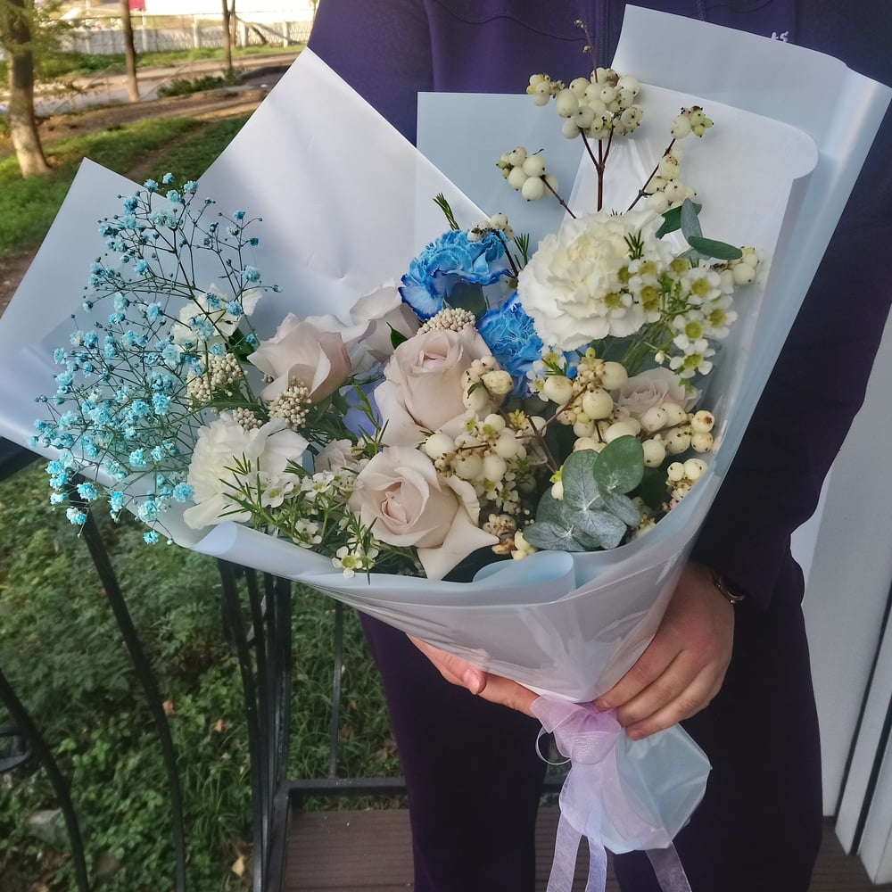 нежно голубые оттенки букета подарят добрые воспоминания или намекнут на начало чего нового, чистого