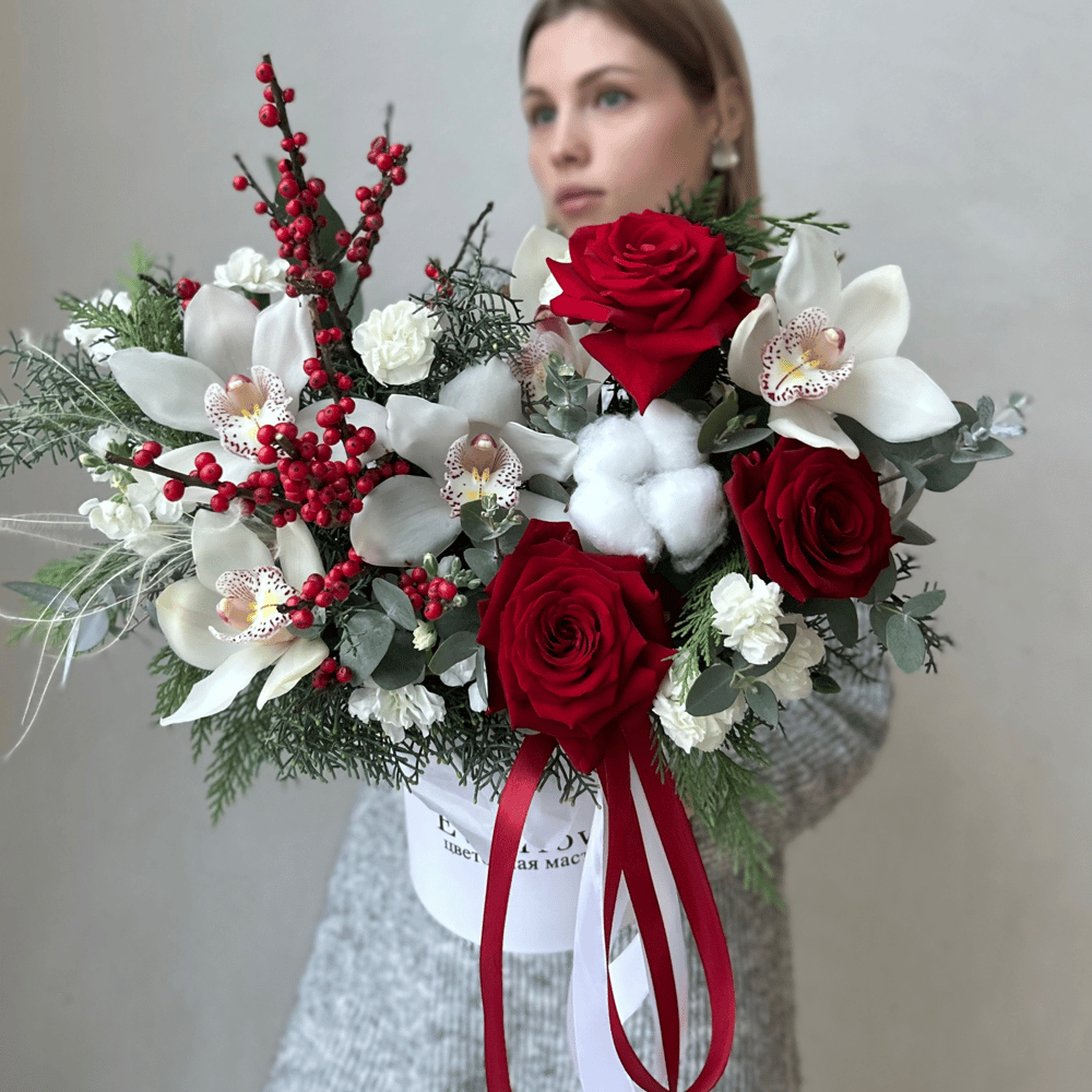 Букет «Зимняя композиция с цветами» из гвоздик и роз