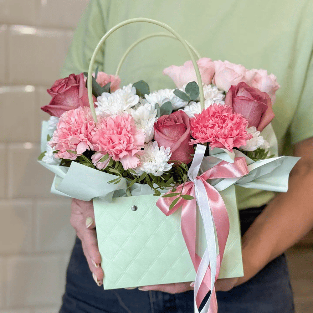 Роза (60) 3 Гвоздика сортовая 4 Роза кустовая 1 Хризантема мелкоцвет 3 Фисташка 0.2 Эвкалипт 0.1 Сумка Оазис