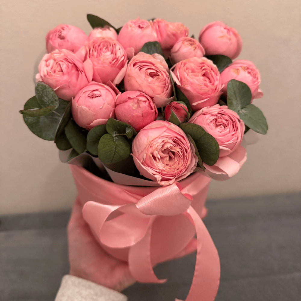 Отличительными чертами пионовидной розы являются пышные многослойные бутоны, которые могут иметь от нескольких десятков до ста и более лепестков, а также приятный, часто сладкий аромат. Эвкалипт придает композии изысканность и очарование. Эмоции в вашем букете доставит наш пунктуальный и вежливый курьер.