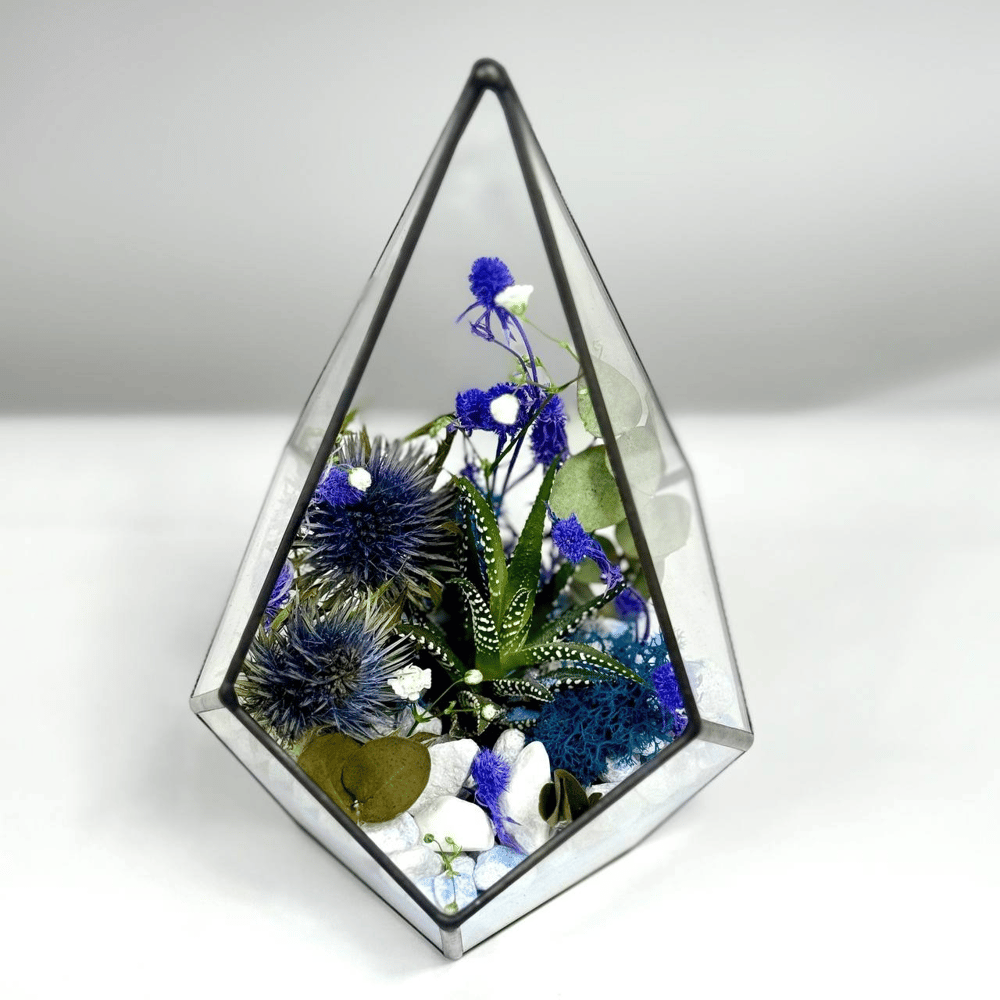 Этот флорариум напоминает упавшую на землю звезду, внутри которой застыл таинственный сад. Графичная хавортия в центре композиции окружена колючими синими сферами эрингиума и мягким лазурным мхом. То…