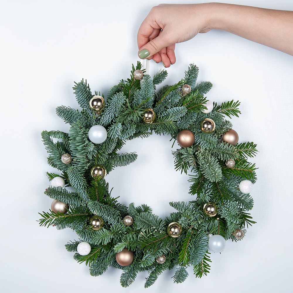 Новогодний венок «Звездная ночь» создан из пушистой ели нобилис и украшен стильным праздничным декором. Композиция напоминает о волшебных зимних вечерах и уюте дома, наполняя пространство атмосферой новогоднего чуда.